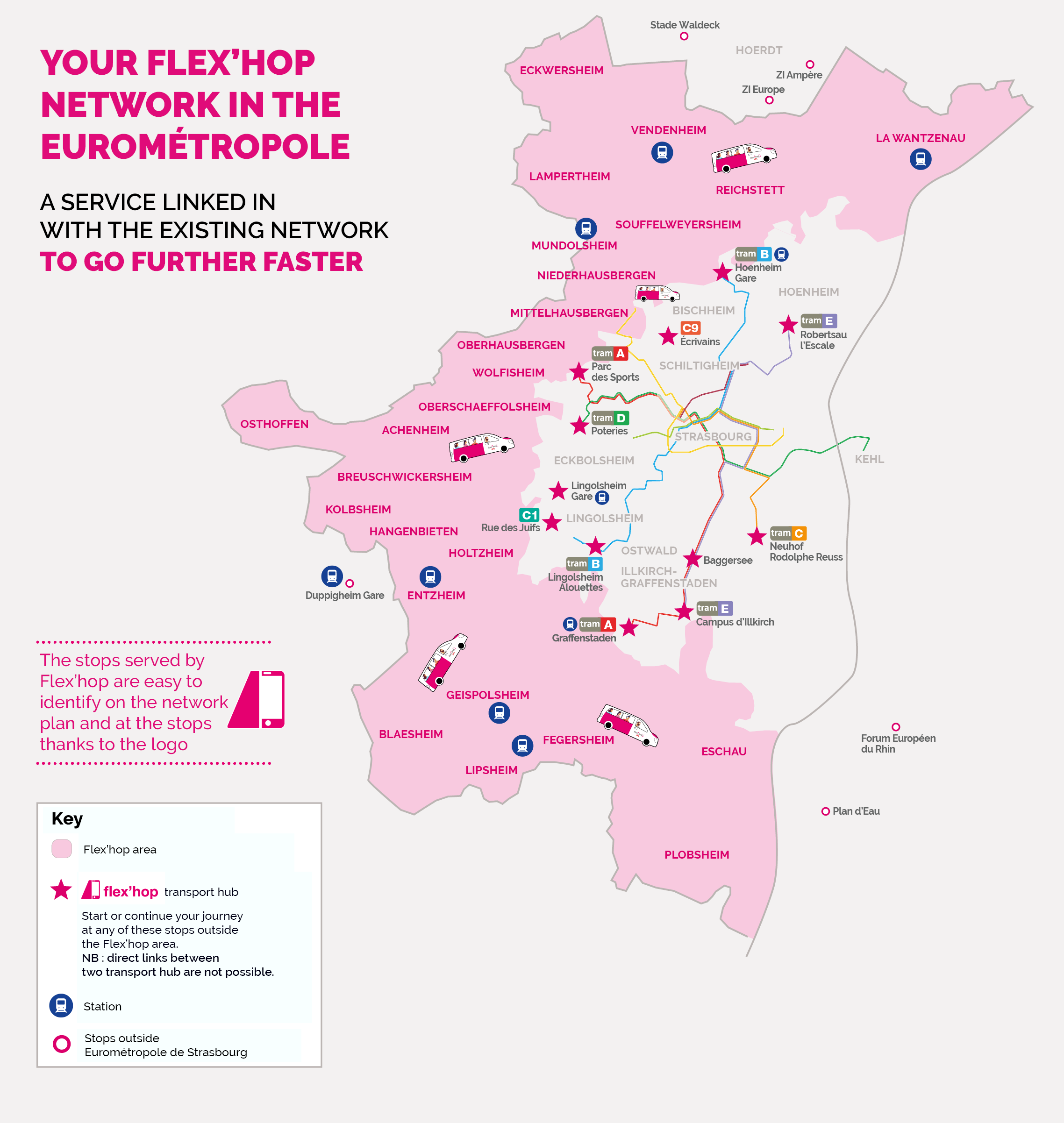 Flex'hop, the public transport service with reservations, completes the CTS bus/tram offer and simplifies your daily life by multiplying the possibilities of direct connections between more than 300 stops located within a large area of 25 communes including business and industrial zones.