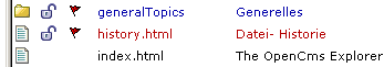 Datei - ÄnderungenWenn Sie mit mehreren Redakteuren zusammenarbeiten, ist es nahezu unmöglich zu erkennen wer wann welche Änderungen an einer Datei oder Verzeichnis vorgenommen hat. Dies ist aber für einen reibungslosen Arbeitsablauf unerlässlich denn nur so ist gewährleistet, dass noch nicht für eine Veröffentlichung vorgesehene Dateien verfrüht publiziert werden. In OpenCms wird daher der jeweilige Status einer Datei oder Verzeichnisses visuell im Workplace dargestellt. Farben