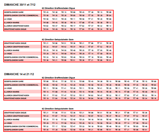 La ligne 62 circule exceptionnellement toutes les 45 minutes environ entre les arrêts Graffenstaden Digue et Geispolsheim Gare :
