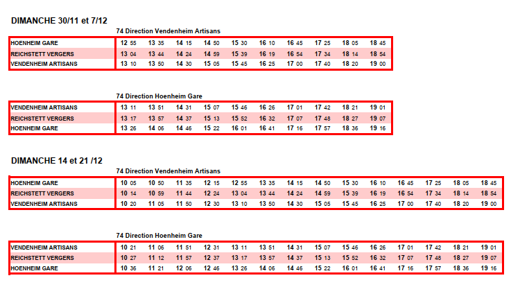 Les bus de la ligne 74 desservent exceptionnellement le terminus Vendenheim Artisans toutes les heures :