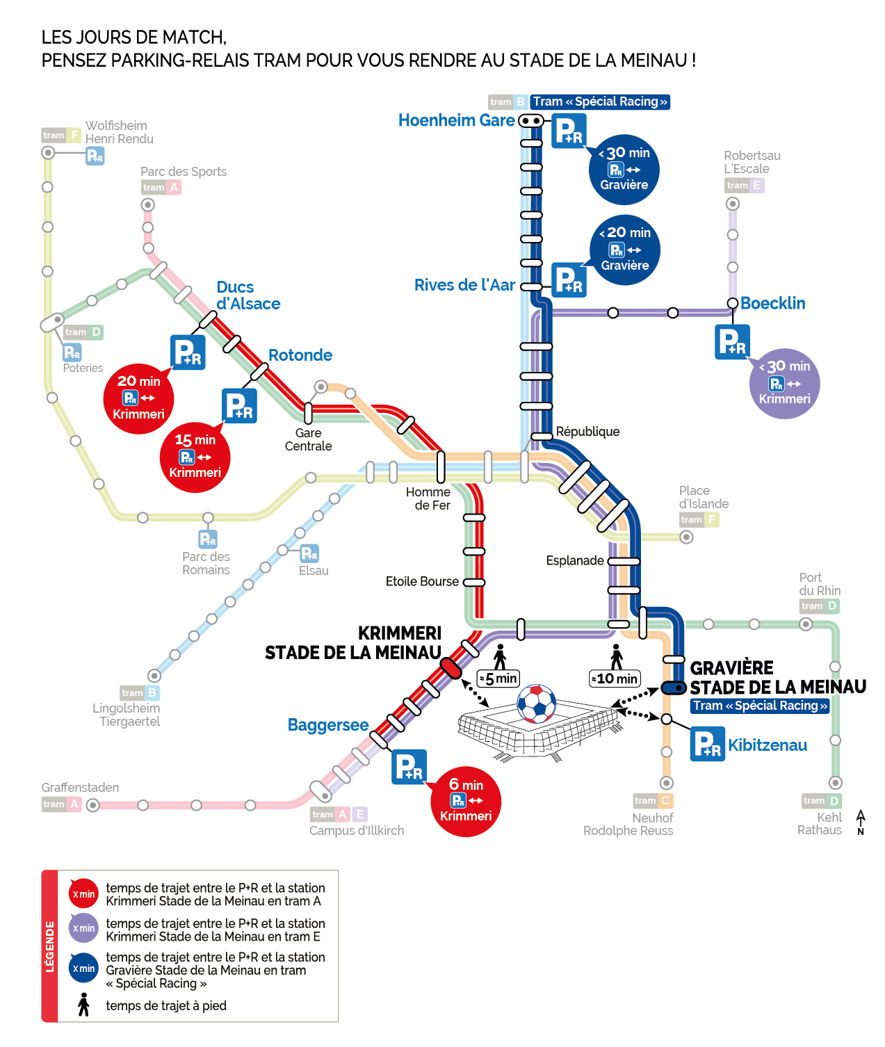 Pour faciliter votre accès au Stade de la Meinau, un tram sera spécialement mis en place pour effectuer un trajet direct entre les stations Hoenheim Gare et Gravière Stade de la Meinau avant et après le match, en passant par les P+R Hoenheim Gare et Rives de l'Aar.