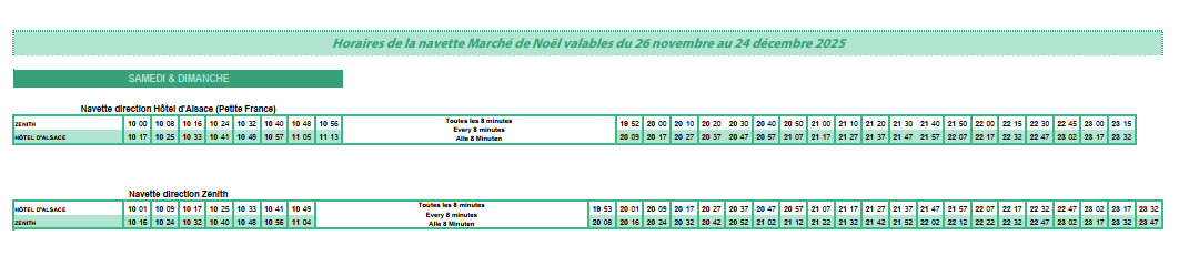 La navette circule en moyenne toutes les 10 min, reliant le parking du Zénith à l’arrêt Hôtel d’Alsace (quartier Petite France) :