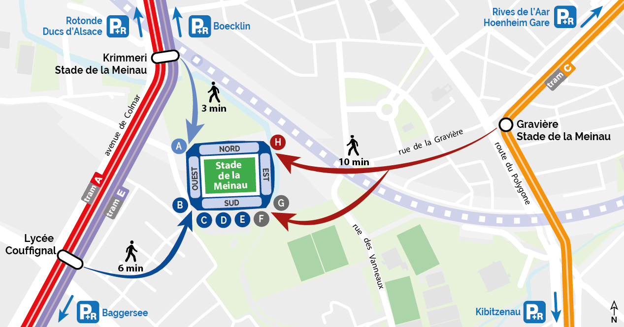 - au P+R Boecklin, prendre le tram E direction Campus d'Illkirch et descendre à la station Krimmeri Stade de la Meinau (à 3mn à pied du Stade).
